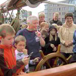 Am 12.09.2011 war es endlich soweit. Mit dem Zug ging es von Neuburg nach Wismar. Nach einem langen Marsch vom Bahnhof zum Hafen war die Spannung inzwischen riesengroß und endlich standen wir vor einem gewaltigen Schiff. Alle Kinder staunten und lauschten gespannt, als ihnen ihre Klassenleiterin, Frau Meyer, die Crew und die Schriftstellerin des Buches, Trixi Hübner, vorstellte.