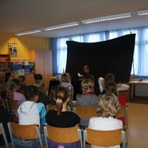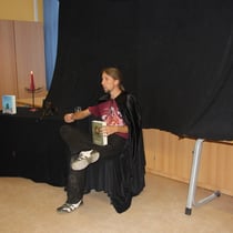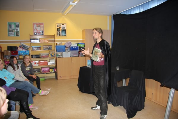 Anne: "Rainer Rudloff besuchte uns an der Neuburger Schule. Er stellte uns 2 Bücher vor: "Herr der Diebe" und "Bartimäus". Das 1.Buch ist von Cornelia Funke. Er spielte mit Gesang und Sprache die Welt der Bücher vor und empfing uns mit Gesang."